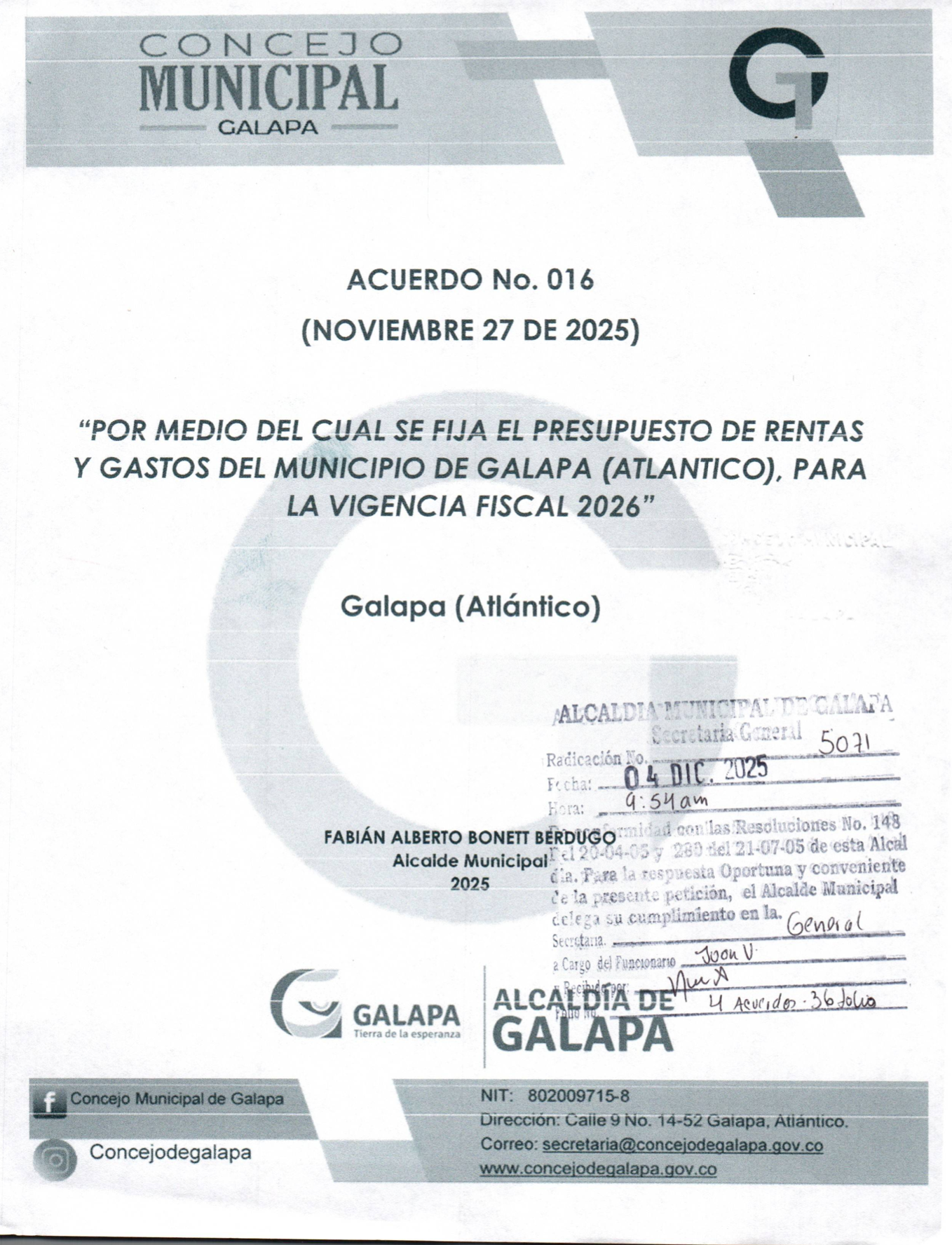 ACUERDO No. 016 DE 2025
