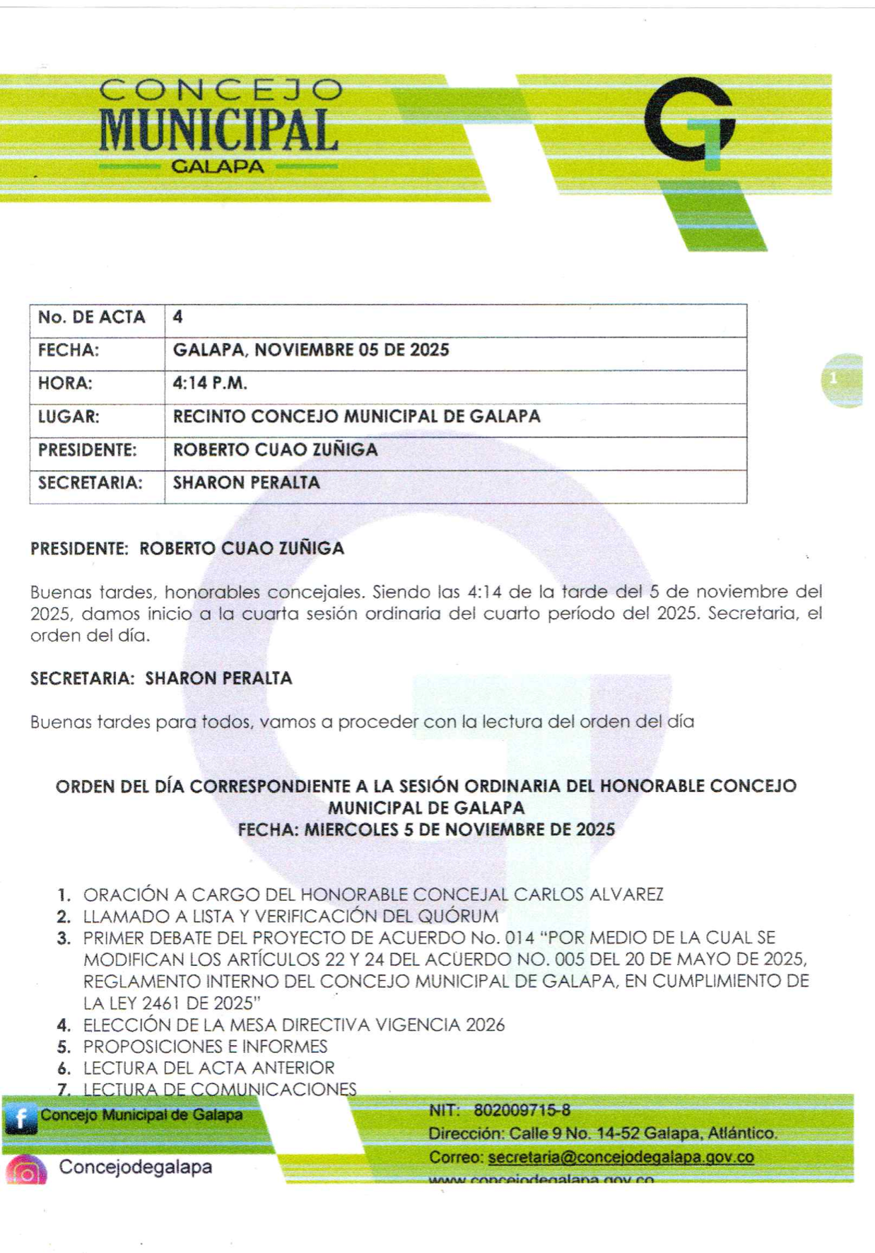 Actas SESION ORDINARIA No. 4 NOVIEMBRE SESION ORDINARIA No. 4 NOVIEMBRE DESCARGAR Leer más » 30 de noviembre de 2025