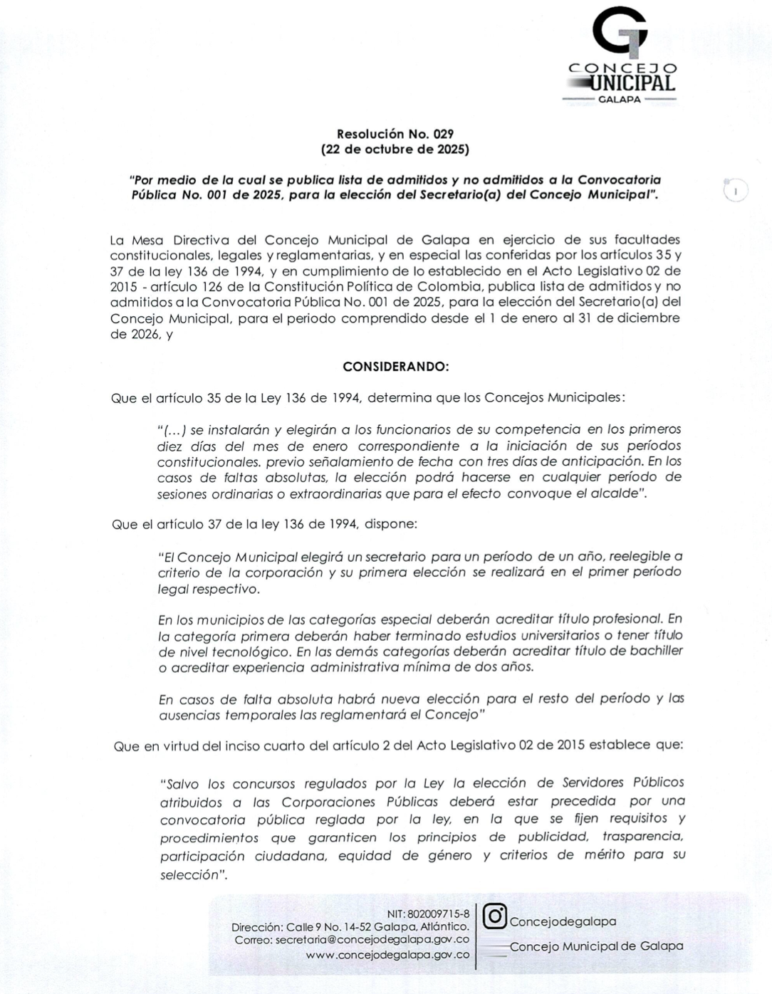 Resolución No. 029-2025 “Por medio de la cual se publica lista de admitidos y no admitidos a la Convocatoria Pública No. 001 de 2025, para la elección del Secretario(a) del Concejo Municipal”