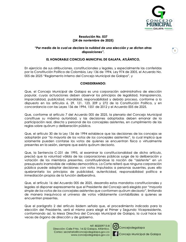 Resolución No. 037-2025 “Por medio de la cual se declara la nulidad de una elección y se dictan otras disposiciones” DESCARGAR