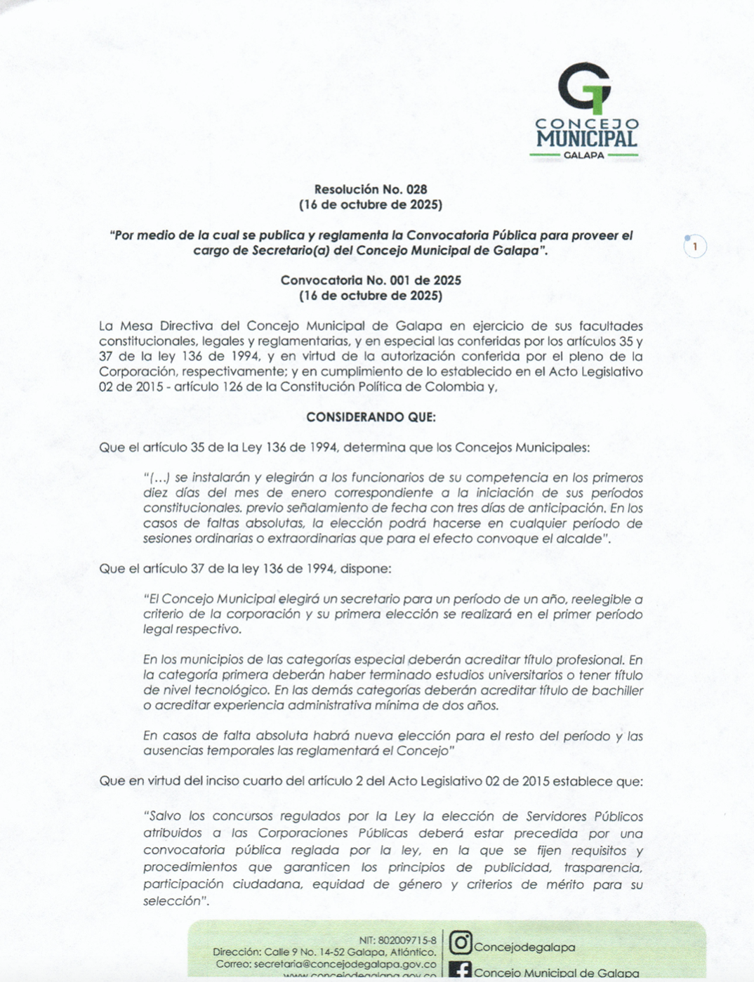 Resolución No. 028-2025 “Por medio de la cual se publica y reglamenta la convocatoria pública para proveer el cargo de