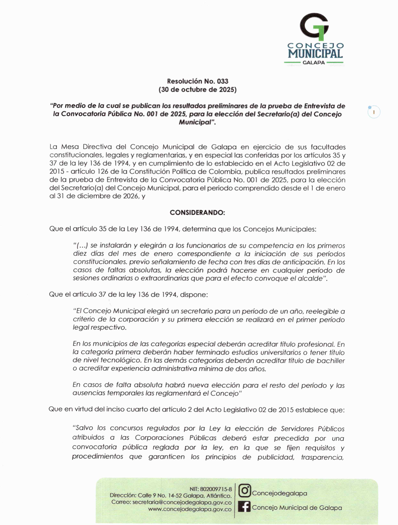 Resolución No. 033 -2025 “Por medio de la cual se publican los resultados preliminares de la Prueba de Entrevista