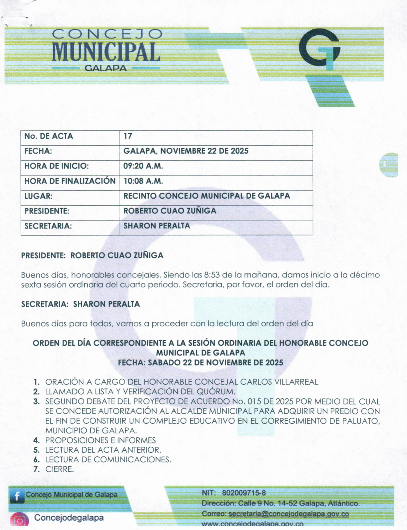 Actas SESION ORDINARIA No. 17 NOVIEMBRE SESION ORDINARIA No. 17 NOVIEMBRE DESCARGAR Leer más » 30 de noviembre de 2025