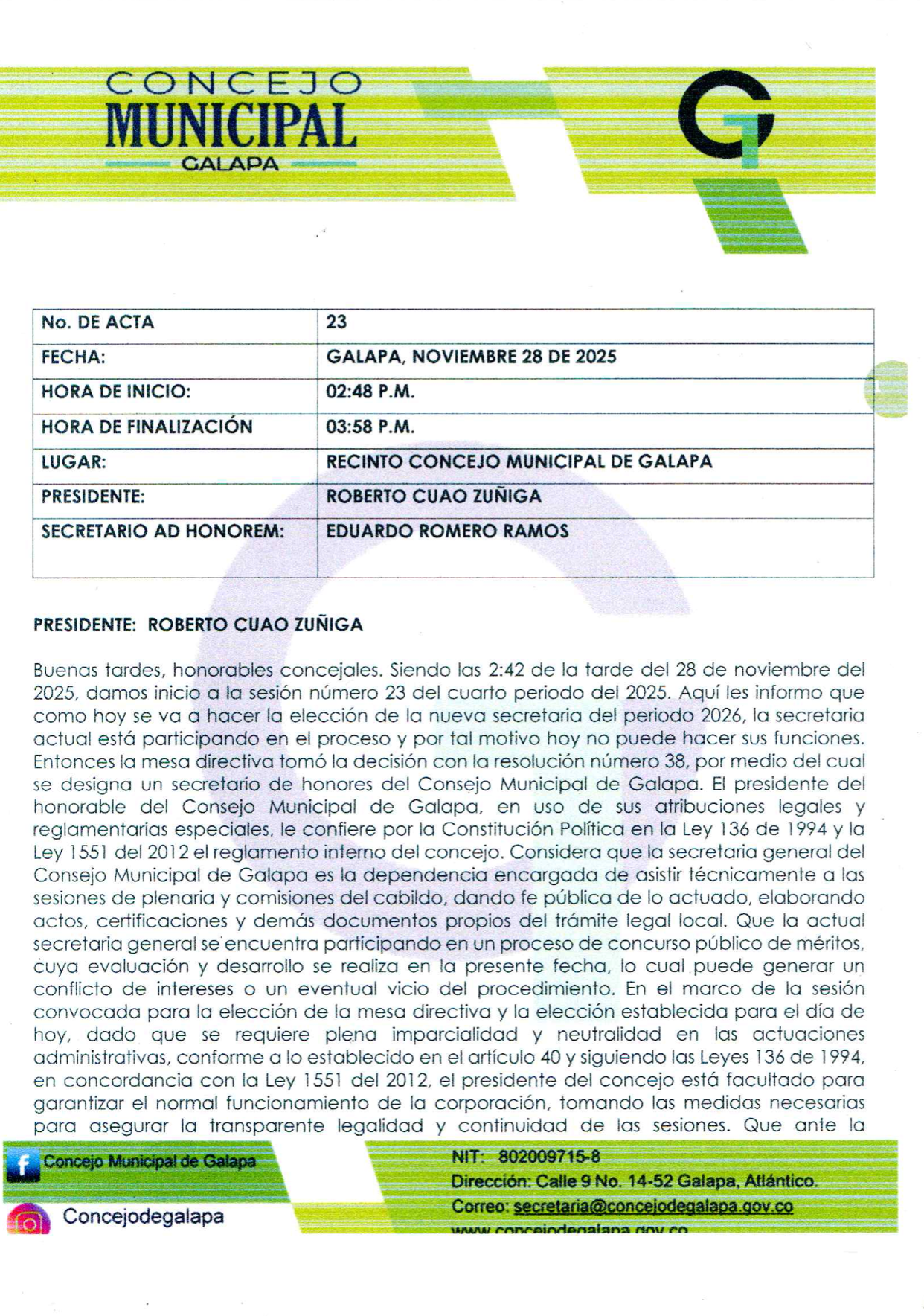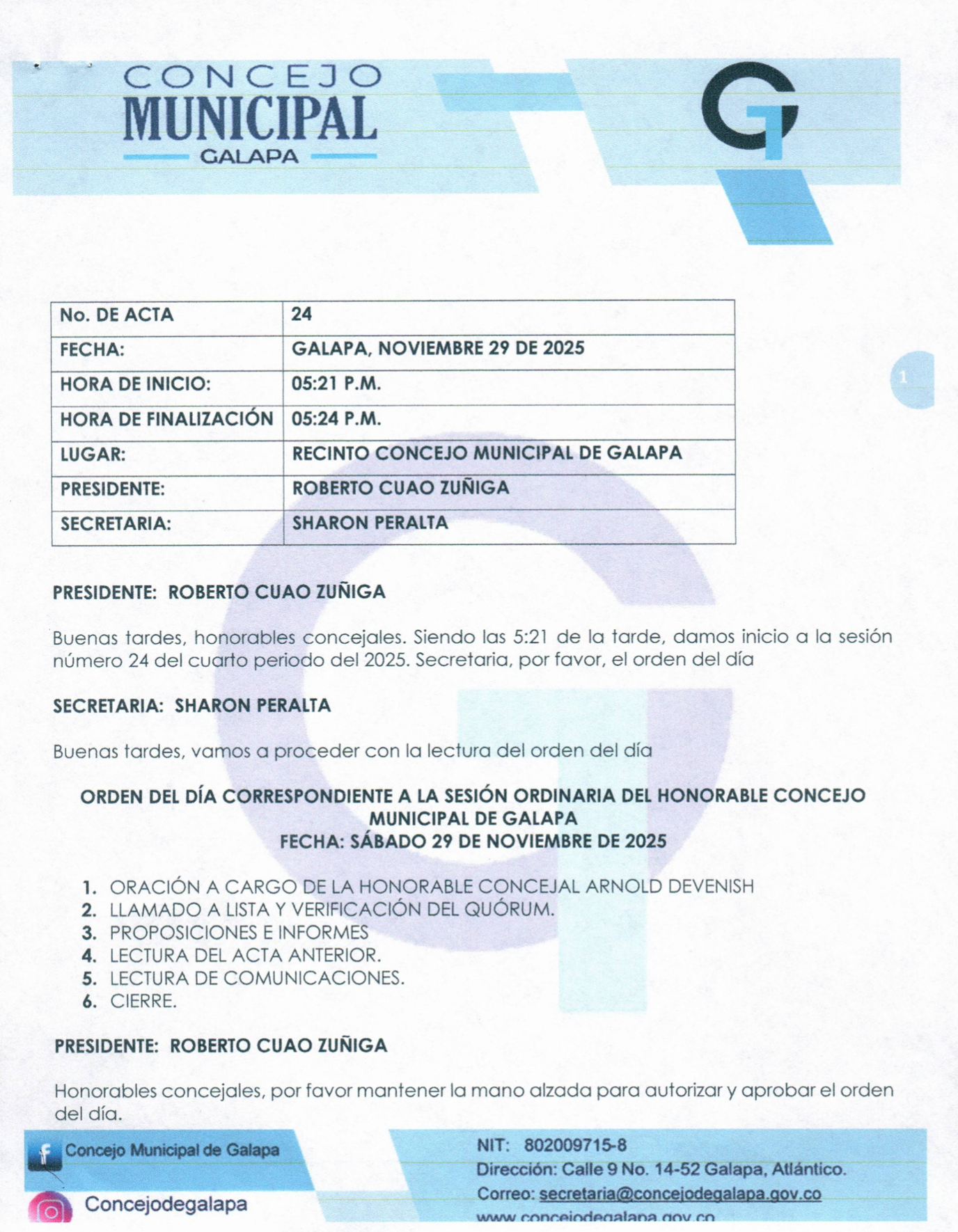 Actas SESION ORDINARIA No. 24 NOVIEMBRE SESION ORDINARIA No. 24 NOVIEMBRE DESCARGAR Leer más » 30 de noviembre de 2025